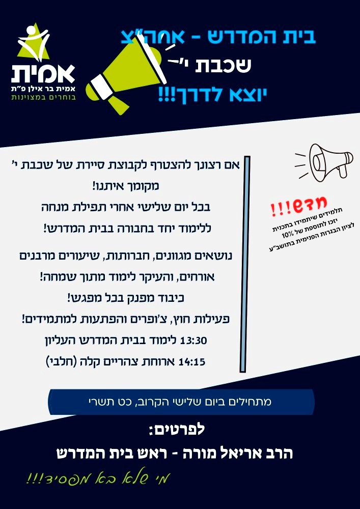 השבוע נפתח בית המדרש אחה"צ לתלמידי שכבת י'. מדי שבוע התלמידיים יגיעו ללימוד מרצונם האישי, בליווי המורה אריאל מורה המוביל את בית המדרש בתיכון. כל זאת, בנוסף לבית המדרש המתקיים מדי יום שלישי לחט"ב בהובלתו של המורה אורי רוזנבלט. תלמידים יקרים – מחכים לכם!
