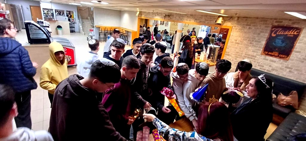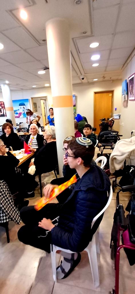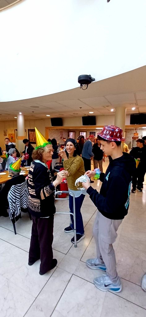 תלמידי שכבה ט’ ביקרו בבית האבות הסמוך לבית הספר, שם שימחו את הקשישים באווירת פורים מרוממת. הם ערכו חידון חגיגי בנושא החג, שרו, רקדו והעניקו רגעים של אור, חיוך וקשר בין-דורי מרגש.