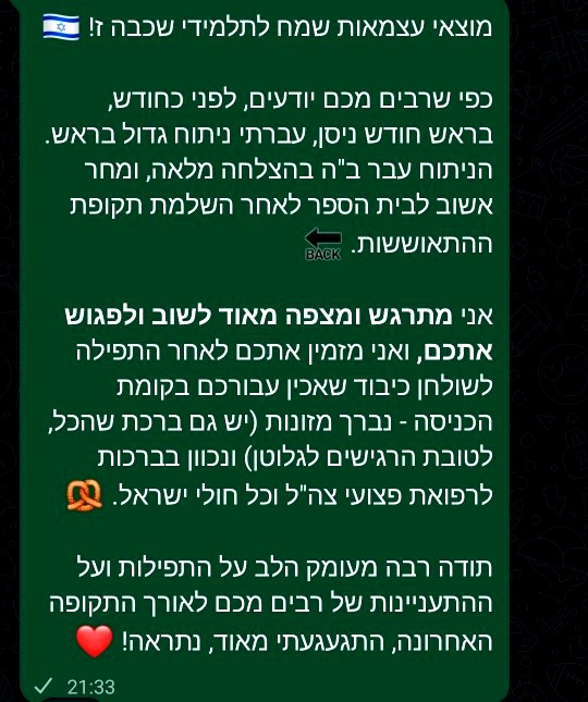 עם שובי לבית הספר אני שב ומודה לכם ולבנים על התפילות ועל ההתעניינות לאורך התקופה. אני מודה לצוות האהוב אשר בהובלת נתנאל ניווטו את בית הספר לעילא ולעילא עם שורה ארוכה של משימות ואתגרים, ובתוך ים של אי ודאות שמזמנת לנו התקופה.